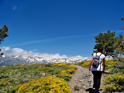 Tras atravesar un pinal, las grandes cimas nos acechan con todavía resto de su blanco invernal. El sendero nos conducirá hasta la misma pista que dejamos allá en la barrera y un mirador con unos paneles informativos muy detallados nos informarán a la vez que participamos de esa información, con unas vistas de la Sierra formidables.